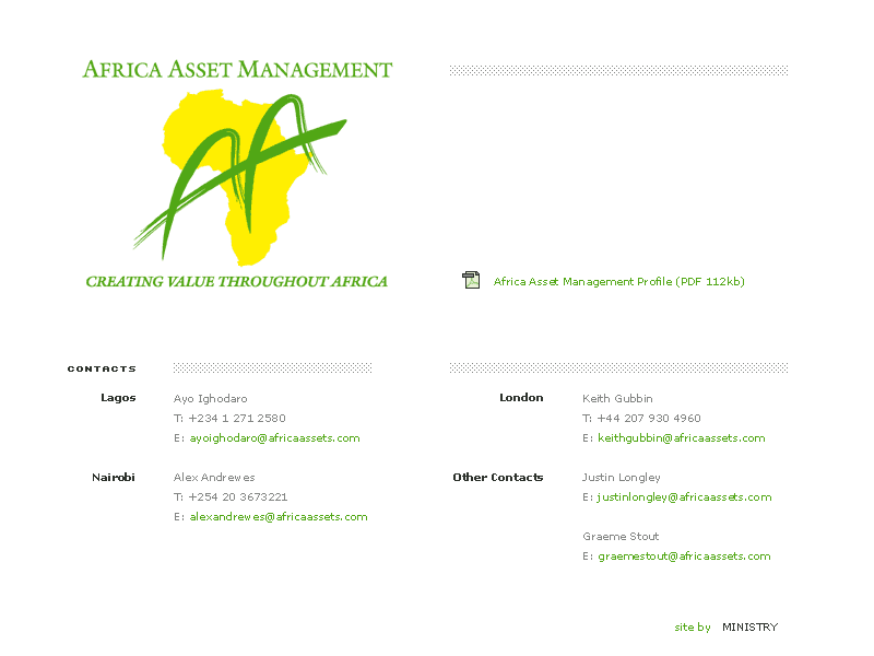 Africa Asset Management Limited was set up by Keith Gubbin and Graeme Stout to meet the needs of companies and financial institutions operating in sub-Saharan Africa or contemplating investing in the African market.